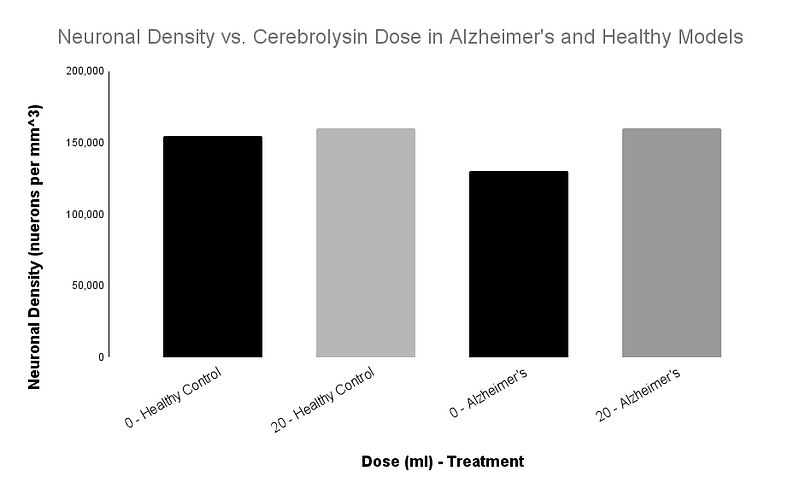 A fictional example comparing the neuronal density of healthy and diseased subjects treated with 0ml or 20ml cerebrolysin. There is a significant difference between nontreated Alzheimer's patients and treated Alzheimer's patients. However, no difference is seen in healthy subjects. A demonstration that a drug can improve health markers in diseased patients but may not improve those same markers in already healthy patients.